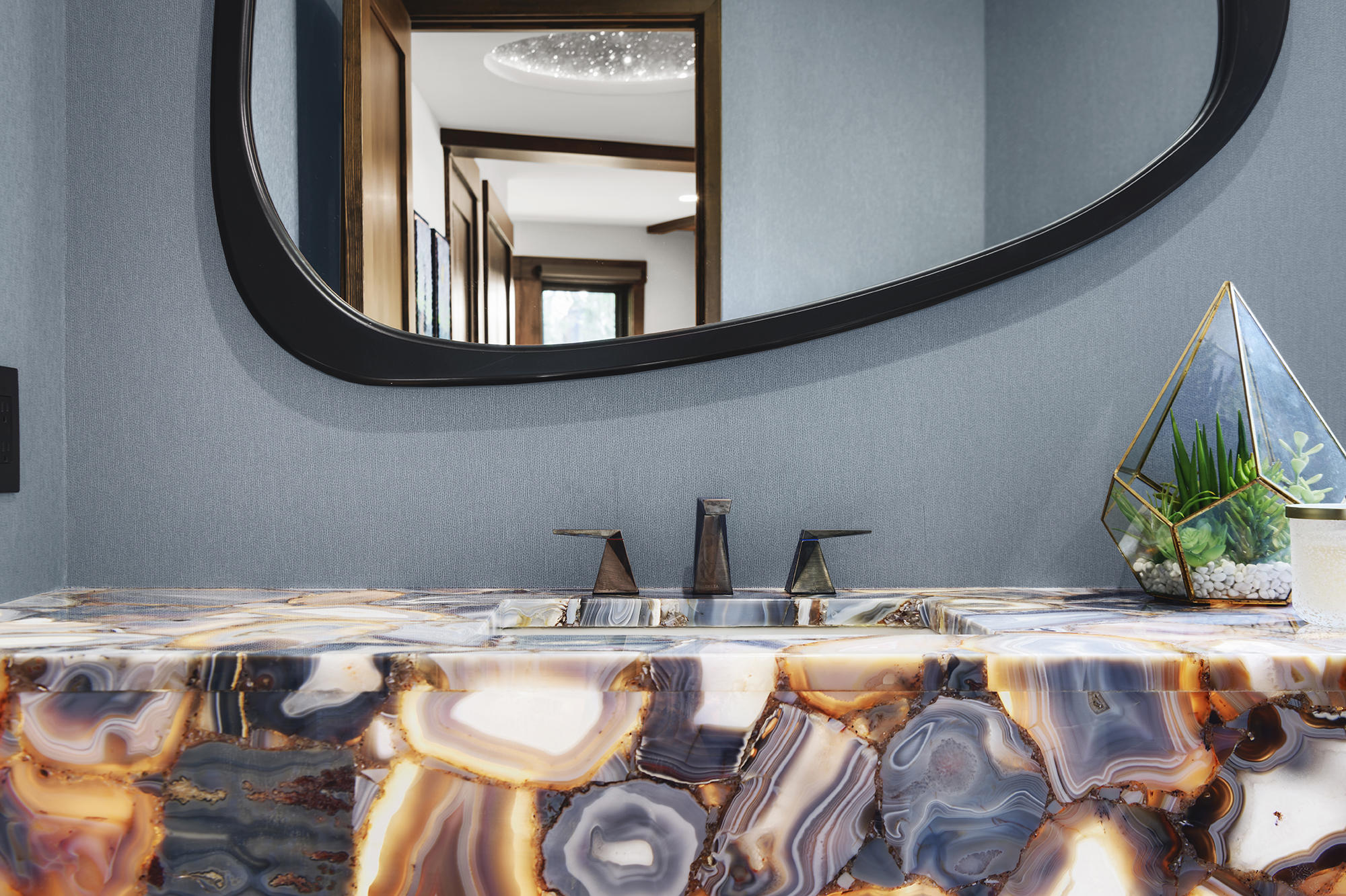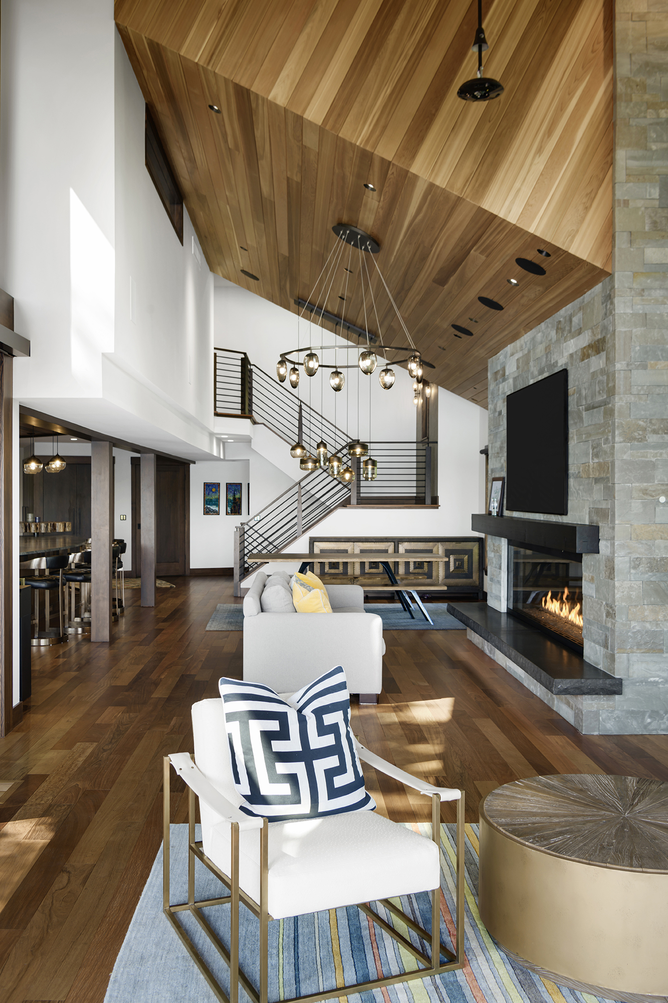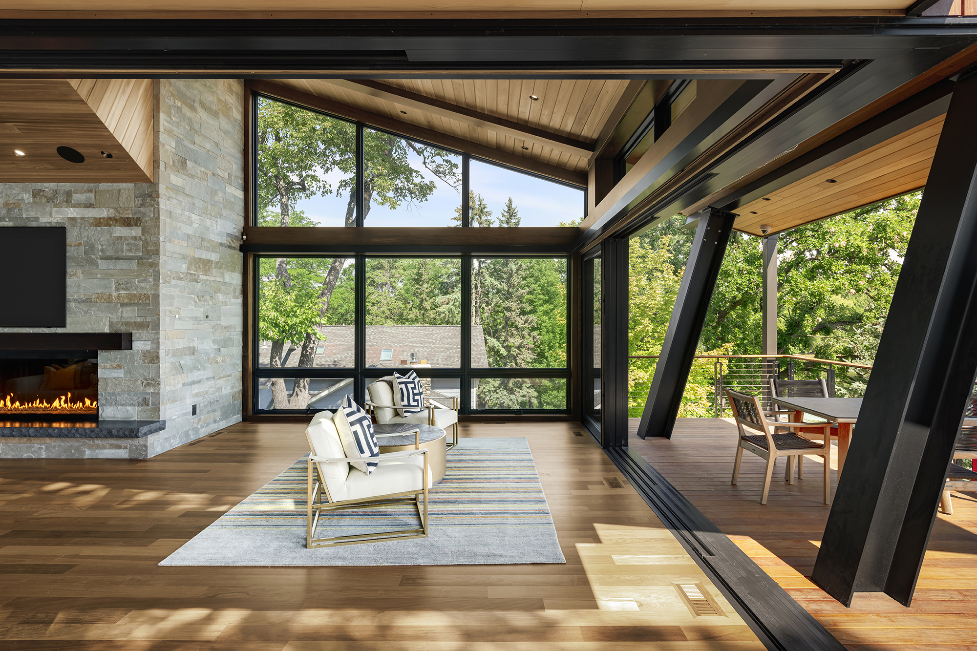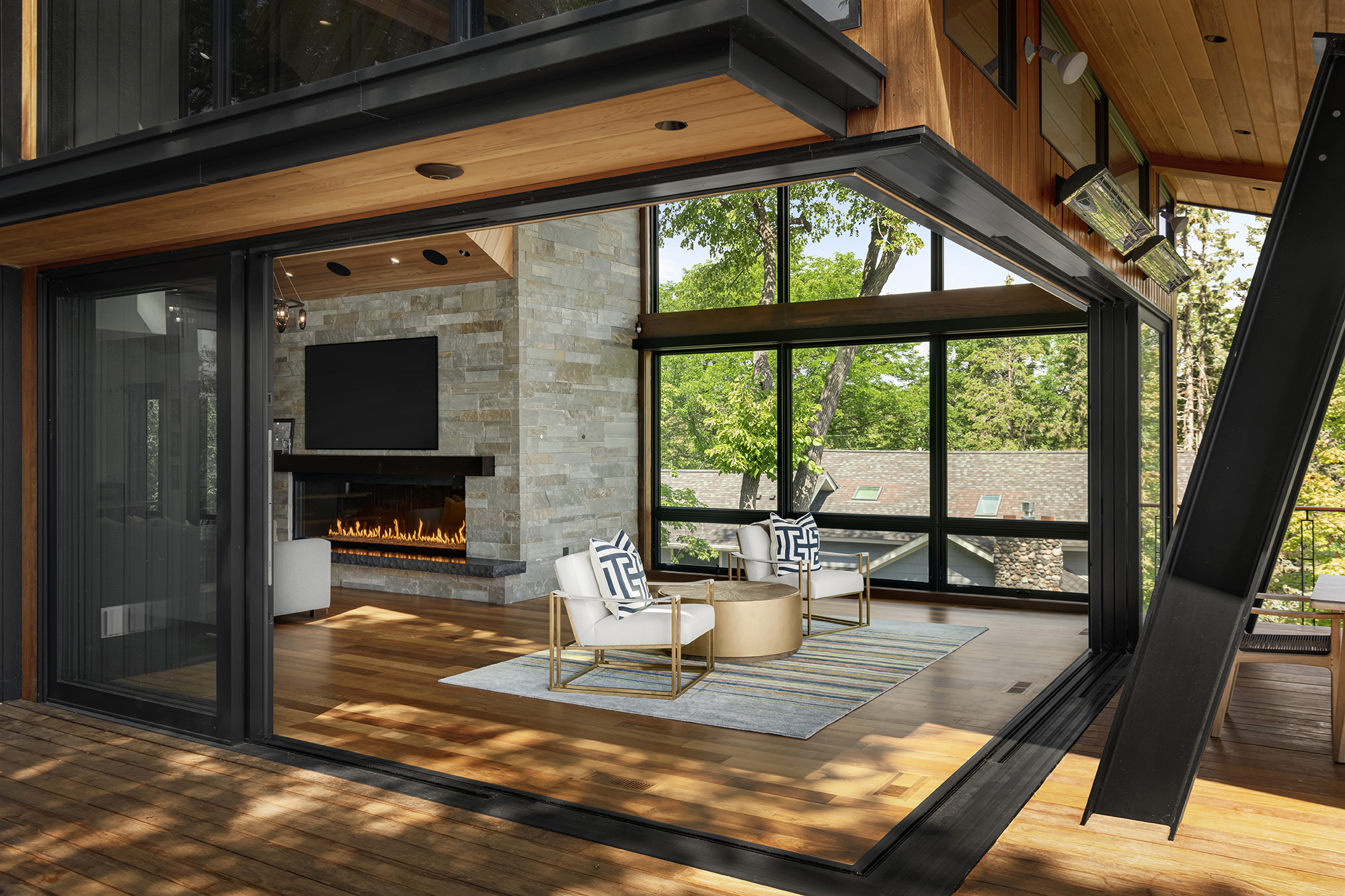 A key architectural feature of the renovation is a dramatic room addition elevated nearly ten feet above the walkout level below. This space includes a cantilevered floor and an adjoining deck, both engineered to appear as though they float above the landscape. A suspended roof extends beyond the room’s exterior walls, providing coverage for the deck while maintaining a light, open presence. An open corner design allows large stacking glass doors to retract fully, creating a seamless indoor-outdoor connection and framing uninterrupted lake views.