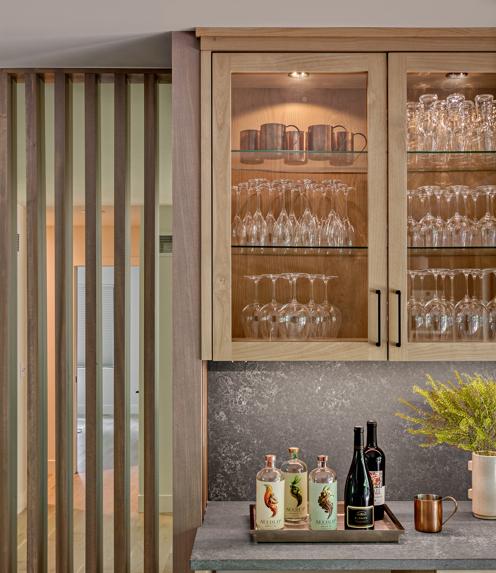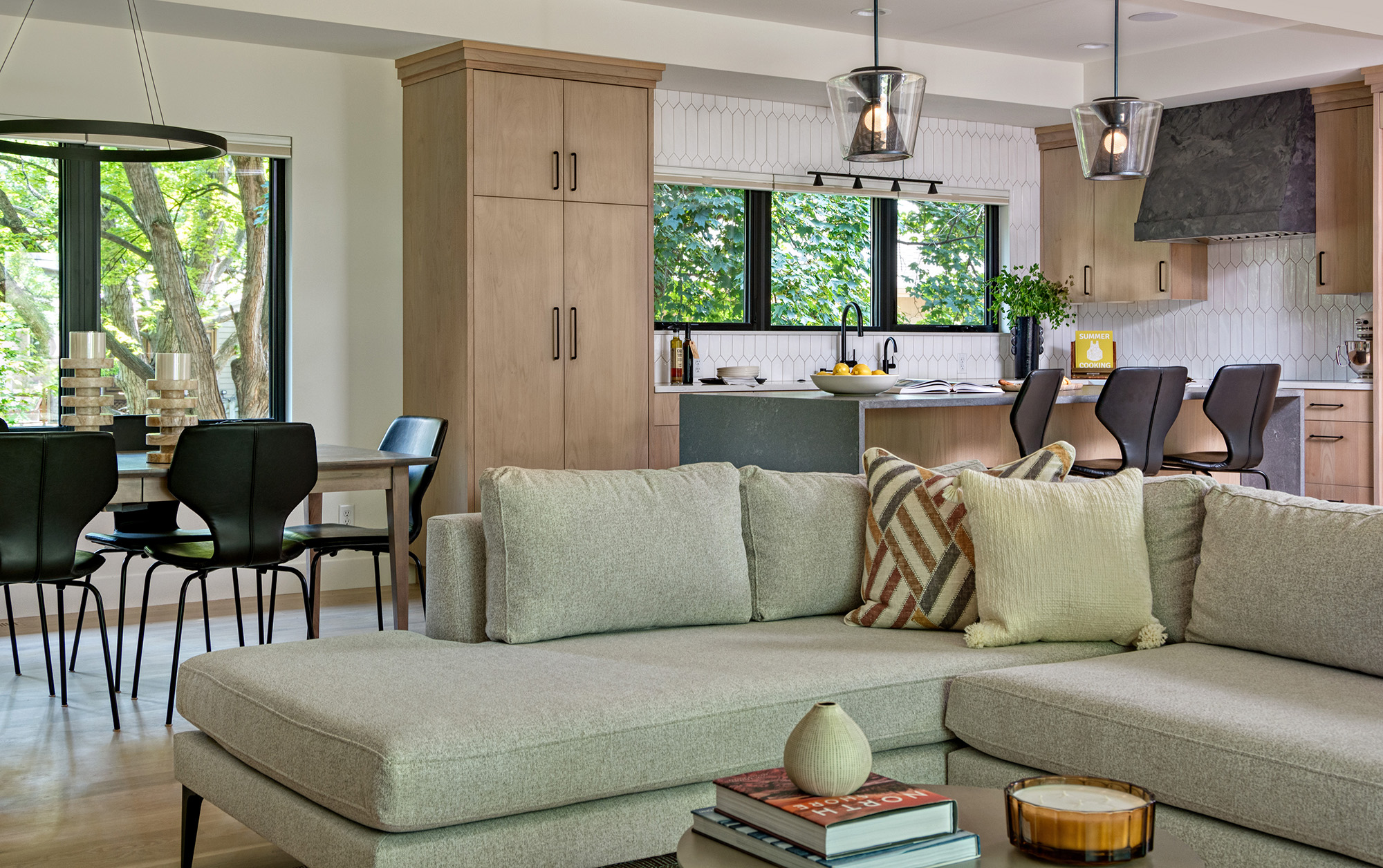 At the center of the renovation is the kitchen, designed to balance functionality with visual impact. A waterfall island anchors the space, offering ample prep and seating while serving as a sculptural focal point. Custom alder cabinetry, finished in a warm stain, brings richness and depth, complementing the home’s updated architecture. Adjacent living areas flow seamlessly, supporting both everyday routines and entertaining.