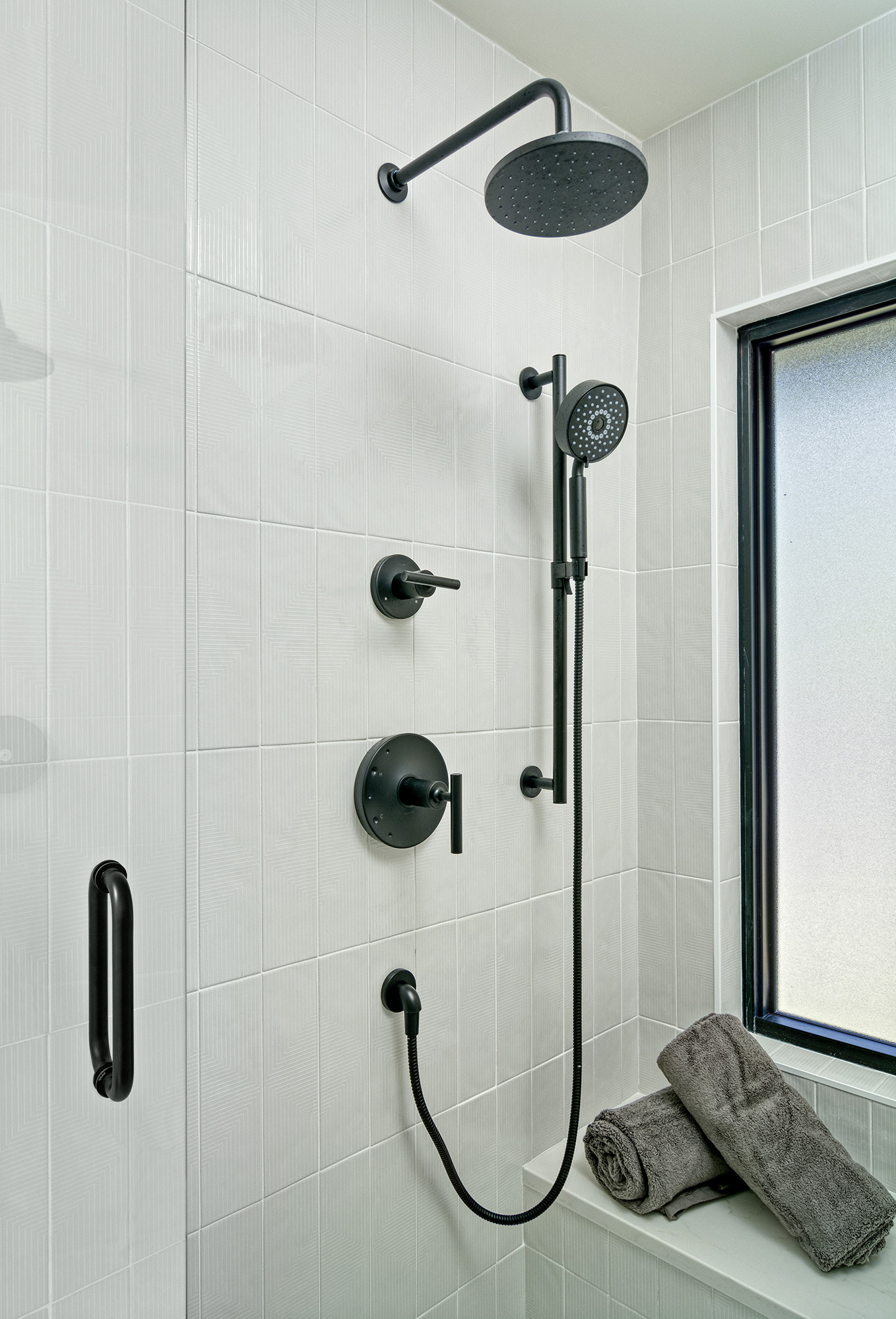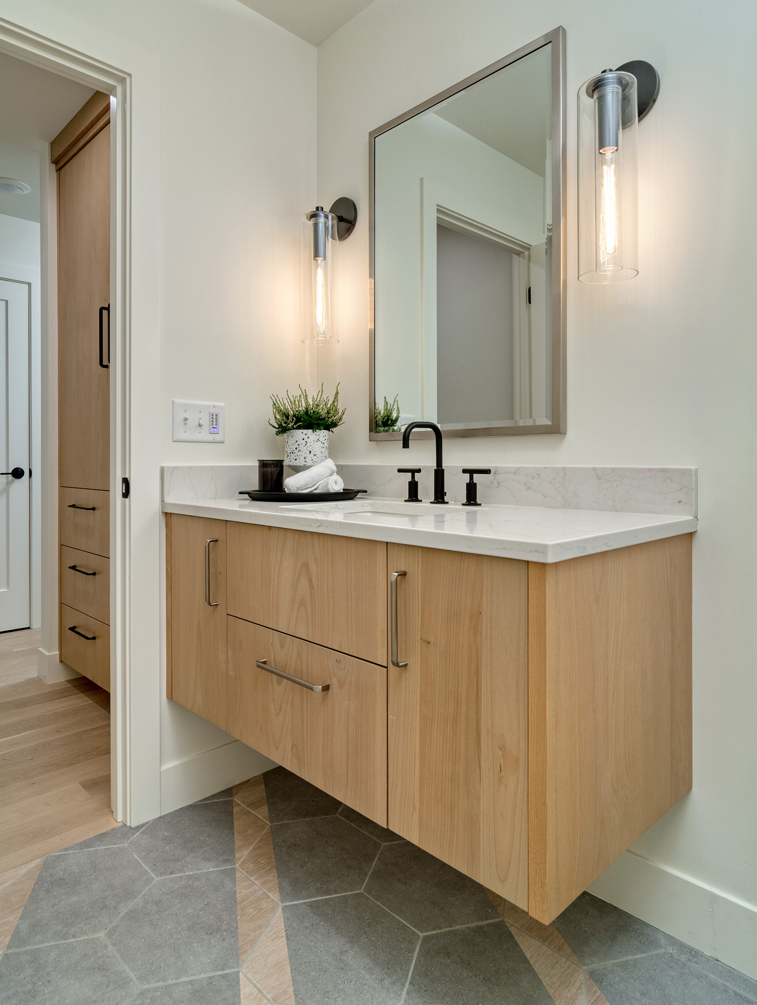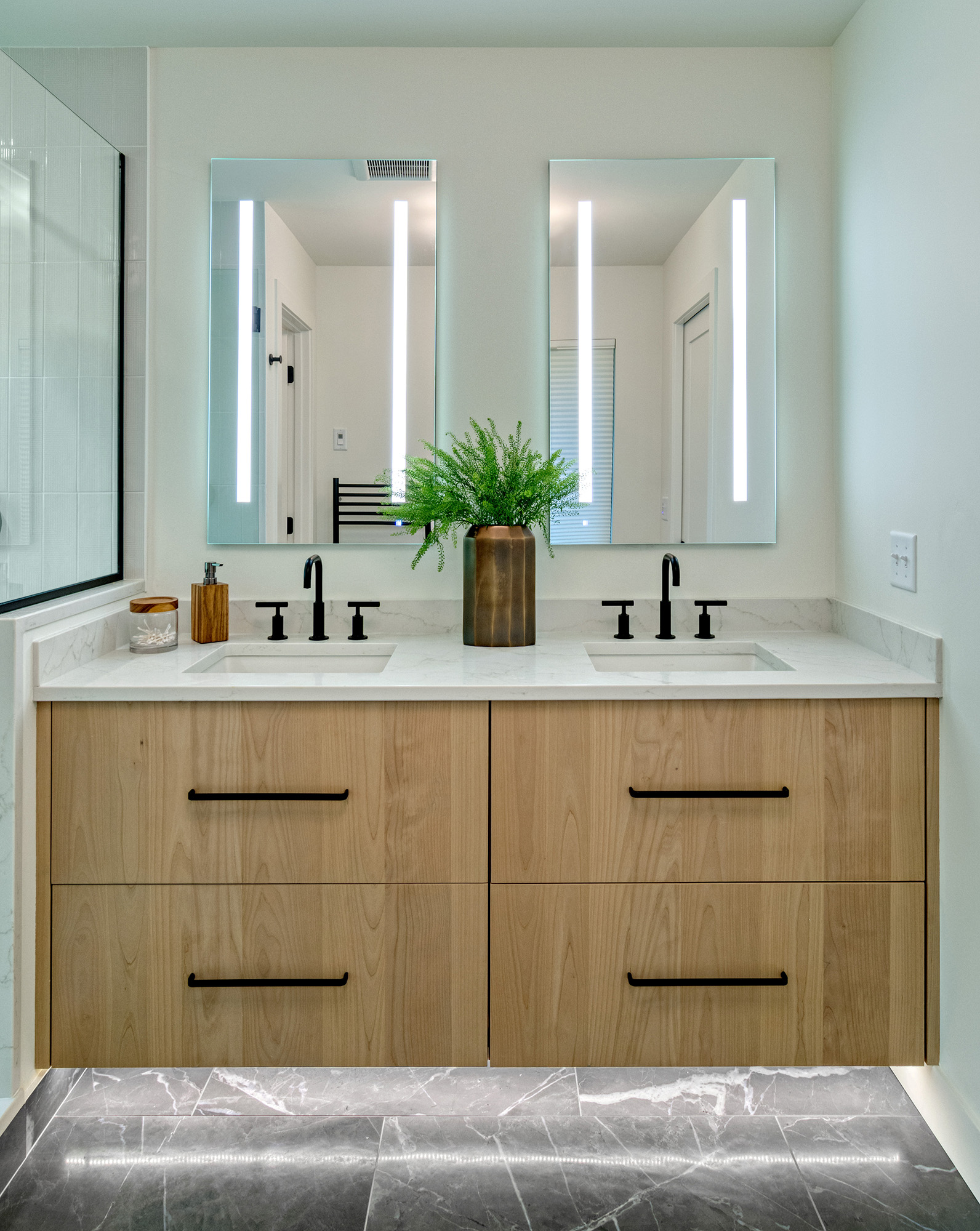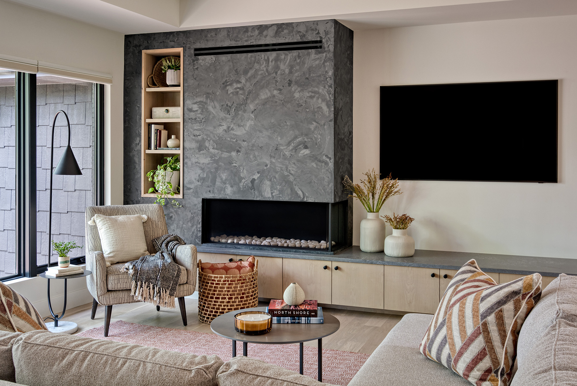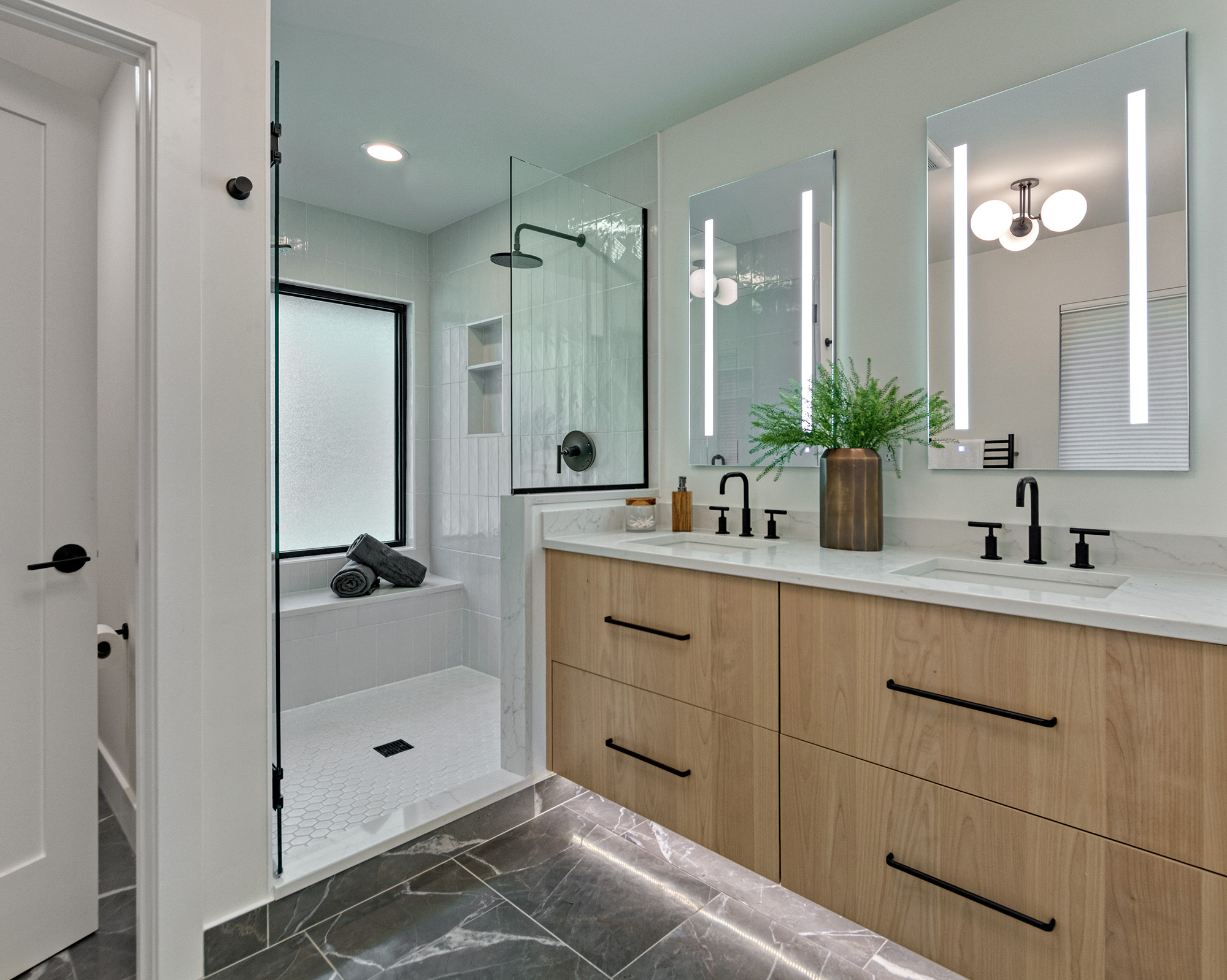 A plaster-finished fireplace face adds subtle texture and craftsmanship to the main living space, creating a refined focal point without overpowering the room. The primary bathroom was also fully remodeled, becoming a calm, private retreat with thoughtful layout and elevated finishes.