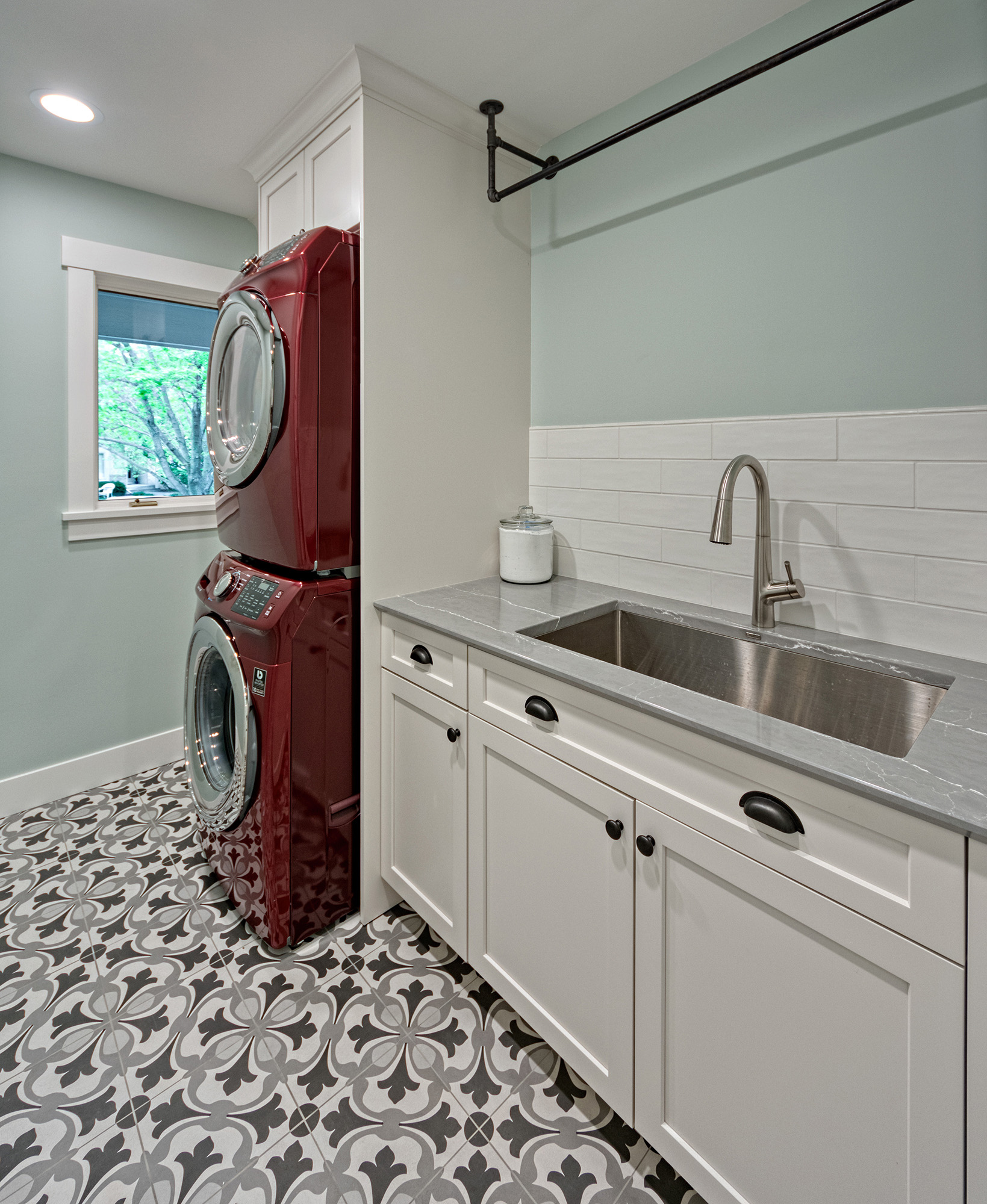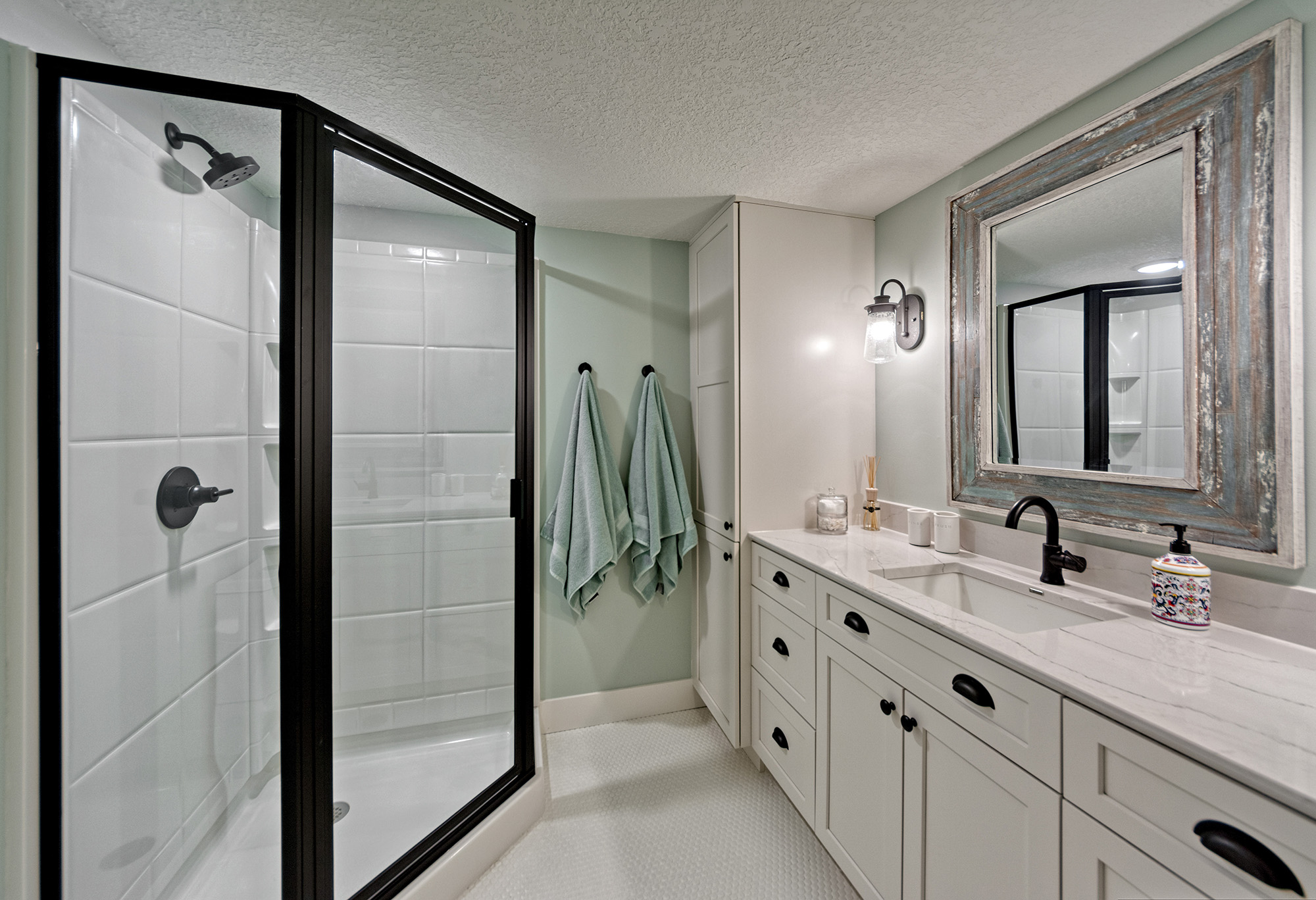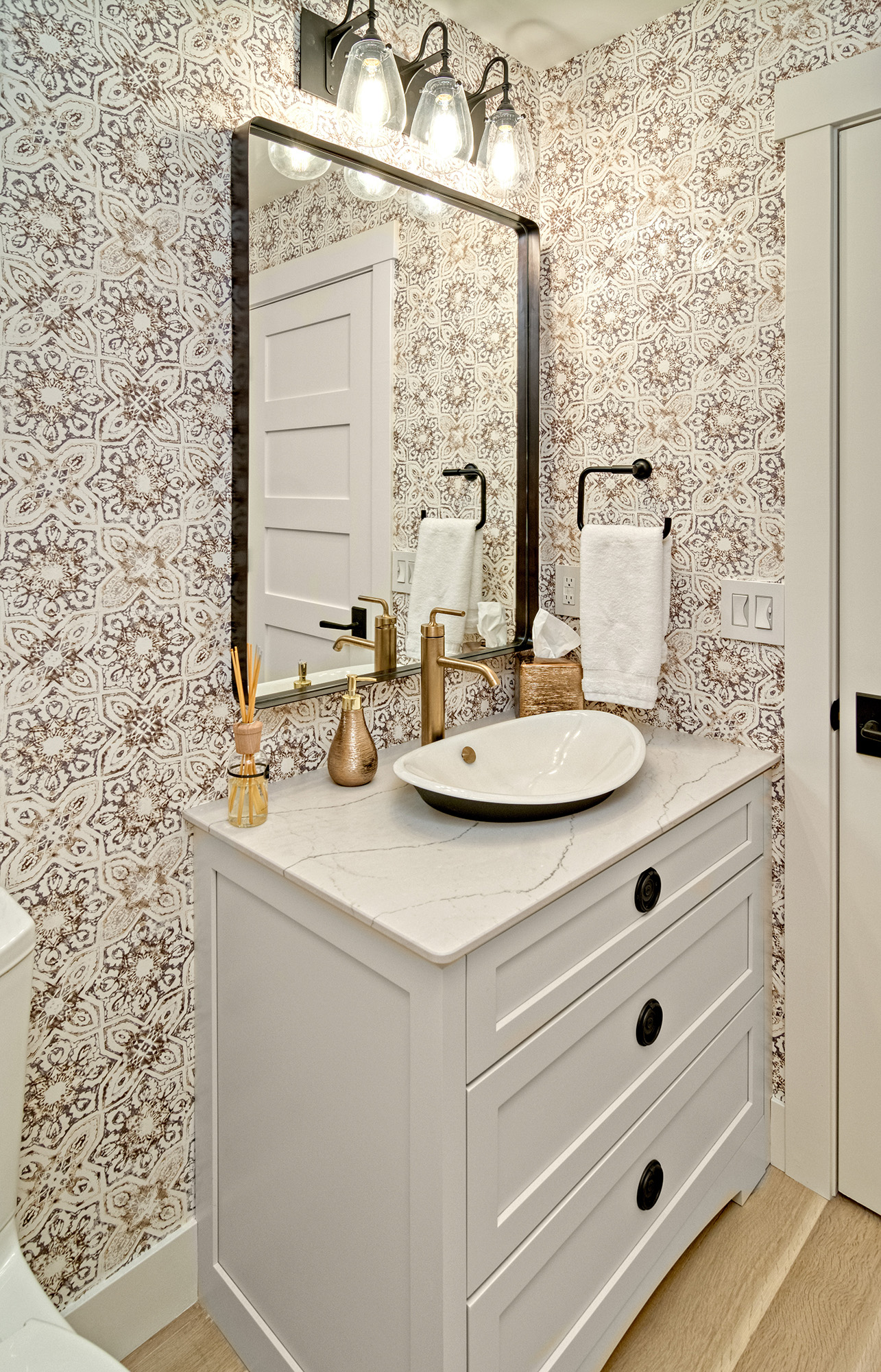 This multi-room renovation project began with stunning new white oak flooring throughout the main level, creating a warm, unified flow. The kitchen was transformed into a serene Scandinavian-inspired space, featuring crisp clean lines, minimalist cabinetry, and timeless elegance. The powder bathroom received a bold update with dynamic wallpaper that adds excitement and personality to the compact room. The laundry and front office and the lower guest bathroom were remodeled during the first phase as well. A second phase of remodeling focused on upper level bedroom spaces. These were all combined into an expansive owner’s suite with two-sided fireplace, sitting area, large walk-in closet, and luxurious bathroom that takes advantage of the fireplace.
